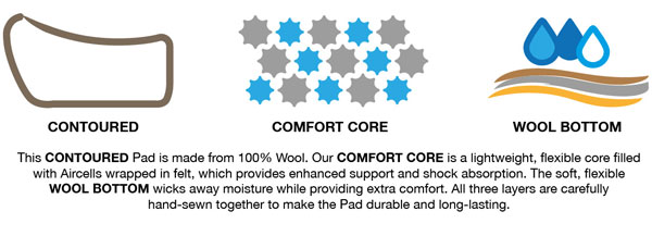Dieses konturierte Pad besteht aus 100 % Wolle. Unser ComfortCore ist ein leichter, flexibler Kern aus luftzellengefülltem Schaum, der mit Filz ummantelt ist und für verbesserte Unterstützung sowie optimale Stoßdämpfung sorgt. Die weiche, flexible Wollunterseite transportiert Feuchtigkeit ab und bietet zusätzlichen Komfort. Alle drei Schichten werden sorgfältig von Hand zusammengenäht, um das Pad besonders langlebig und strapazierfähig zu machen.